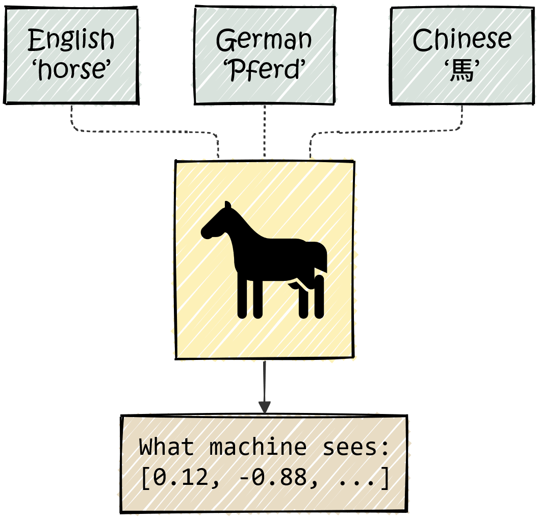 The letters h-o-r-s-e do not inherently imply a hoofed mammal that runs fast. In German, the same animal is “Pferd.” In Chinese, it is “馬.” The spellings are completely different, yet they refer to the same real-world creature — they are just symbols that represent the same concept.