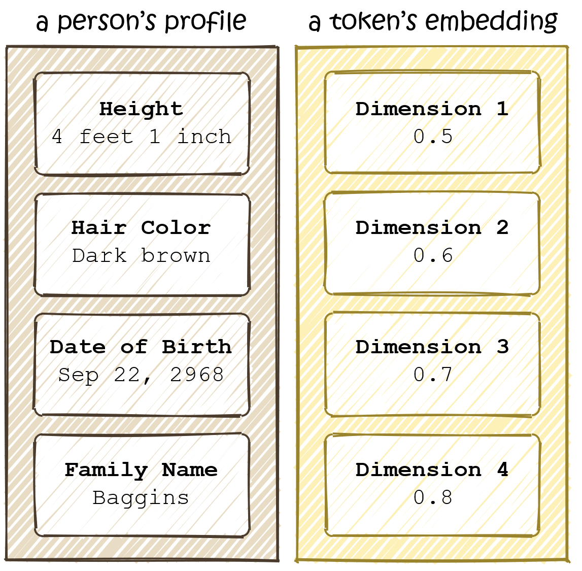 Each number in a token’s embedding vector describes the token along one dimension (a.k.a. feature). You can think of it like this: just as a person might be described (and thus identified) along multiple dimensions like height, age, hair color, a token is described along some learned dimensions.
